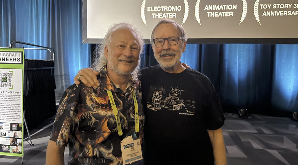 On Sunday, 10 August, Ed Catmull gave the prestigious Pioneers Featured Speaker address for 2025. Catmull’s presentation was the kickoff event of the conference, and drew a record standing-room-only crowd to hear his recollections about the making of Toy Story, the world’s first all-CGI animated feature film. His presentation happened to fall on the 30th anniversary of the 1995 blockbuster, so Siggraph Computer Animation Festival Chair Dawn Fidrick worked with Pioneers Chair Ed Kramer to make Catmull’s talk the introduction to a special 30th anniversary screening for conference attendees of a pristine remastered copy of the landmark film. Video of Catmull’s moving talk is available on Siggraph’s YouTube channel at